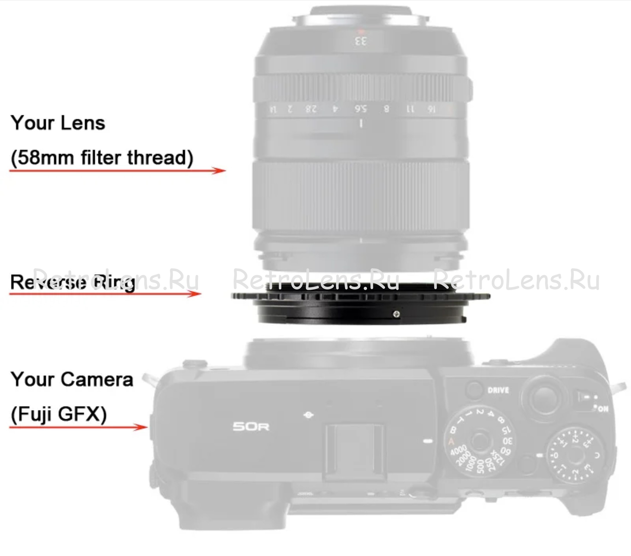 M58-GFX — реверсивный адаптер фирмы Pixco для установки объективов с креплением фильтра резьба М58 обратной стороной к камере GFX. Это даёт хороший режим макро! На адаптере резьба М58 папа. Объектив при этом будет работать только в мануальном режиме, так что удобно использовать старые мануальные объективы ЛЮБОЙ фирмы и с ЛЮБЫМ байонетом! Новый.